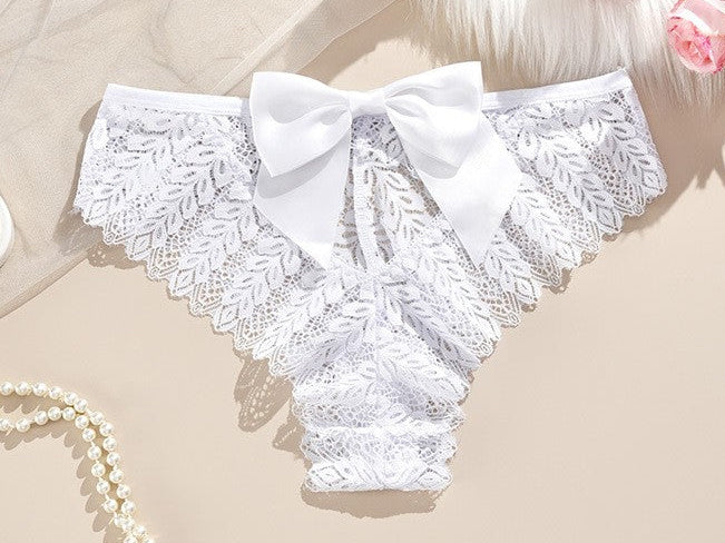 Sexy lace knickers with scalloped hem and satin bow with floral detail.